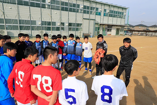 真備東中学サッカー部、元キャプテンの3年・藤本兼輔君はこう話します。「プロの選手から直接、教わるのは初めてでしたが、的確な指示をしてくれました。ゲームではレベルが違いました(笑)。安在和樹選手がオーバーヘッドをした時点で、ヤバかったです。あんなコースに打てるのかって、肌で感じられて楽しかったです。機会があればリベンジしたいです(笑)」。